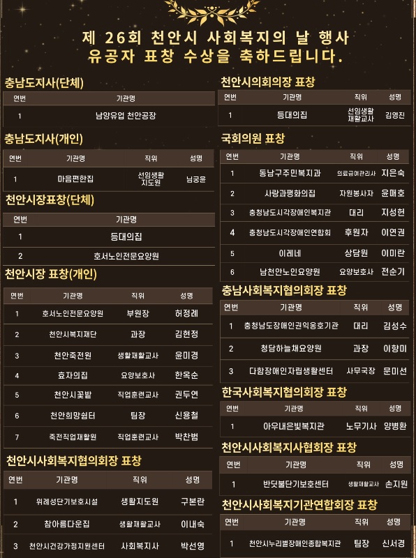 제 26회 천안시사회복지의 날 행사 유공자 표창수상 페이지 정보 작성자작성자 : 천사협 조회조회수 : 1,185회 작성일작성일 : 25-09-23 13:14 본문 수상을 축하 드립니다! 목록 이전글2025년 법인 정기 이사회의(2차) 개최 25.03.11 다음글「제26회 천안시사회복지의 날 행사」사회복지 유공자 추천 협조 요청 25.07.28